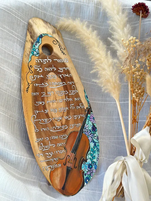 מזמור לתודה כתוב בכתב יד מסוגנן ומעוצב בעיטורי פרחים סגולים ותכולים עם כינורו של דוד המלך, כתוב על פיסת עץ טבעית בגודל 35 ס״מ .