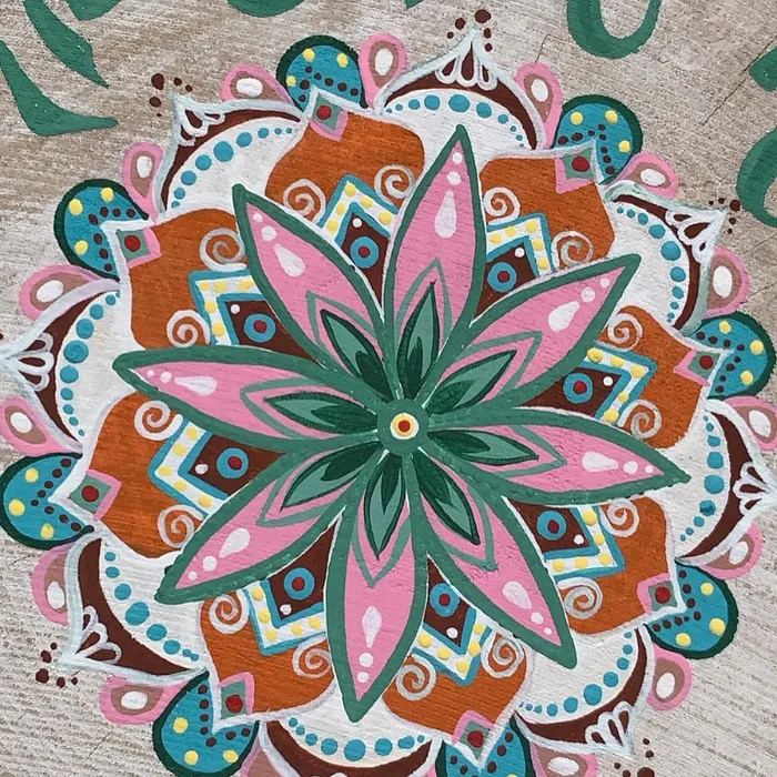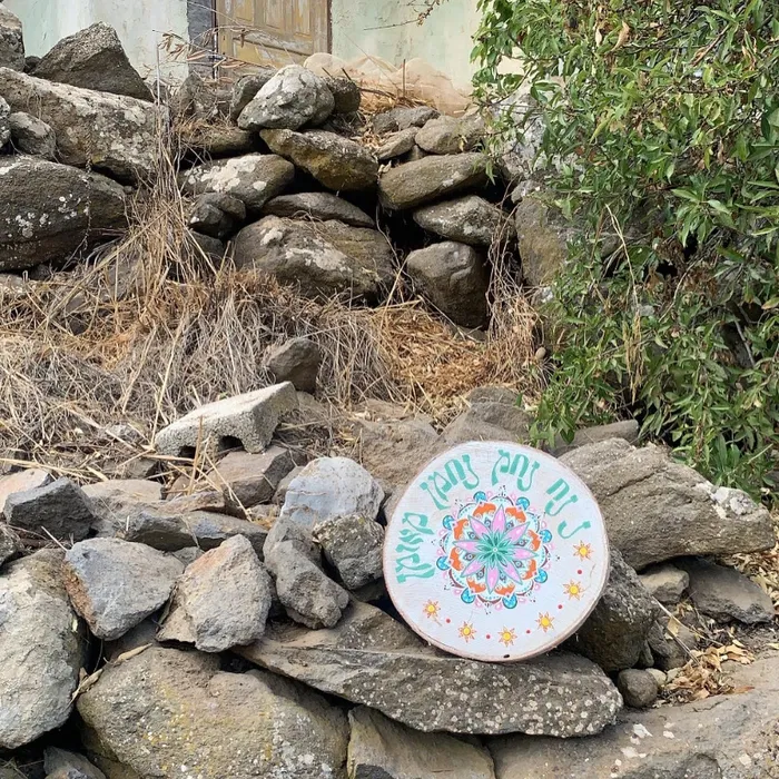ציור מנדלה מסוגננת בצבעים חיים ושמחים עם הכיתוב ״ ננח נחמ נחמן מאומן״ המוסיפה אור ושמחה יהודית לבית