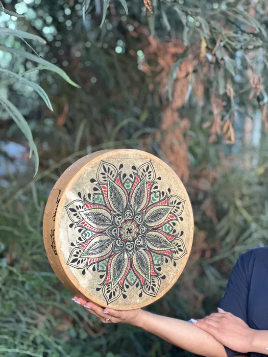 מעוטר בציור מנדלה ססגונית ומדוייקת, בצבעים מרהיבים- אדום, צהוב ירוק ושחור המייחדים את התוף ומעשירים אותו.