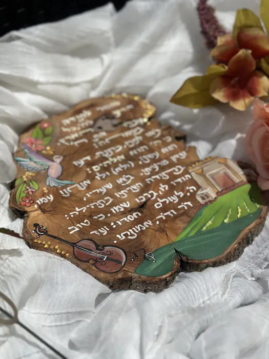 "מזמור לתודה" מספר תהילים כתוב בכתב יד ומעוטר בציורי ציפור שיר, פרחים וורודים וססגוניים, בית המקדש על נוף שדות וכינורו של דוד המלך. היצירה על פיסת עץ זית טבעית בגודל 20 ס"מ ועובי ס"מ אחד
