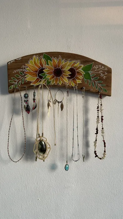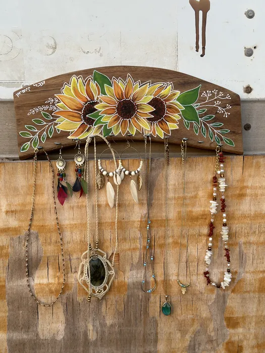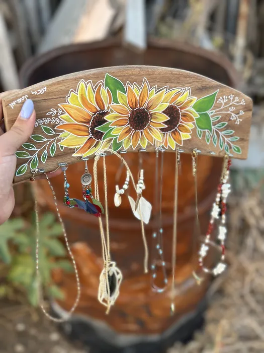 מתלה לתכשיטים מעץ עם ציור של חמניות צהובות מעוטרות הוא מתנה מקורית ונפלאה להעניק לאישה אהובה, מתנה מבעל לאשה ומחברה לחברה.