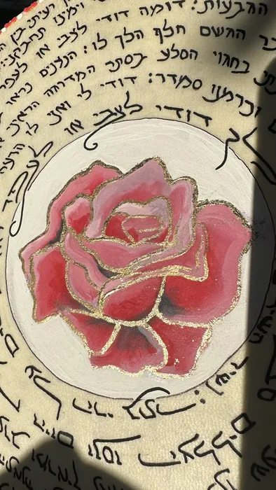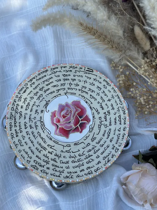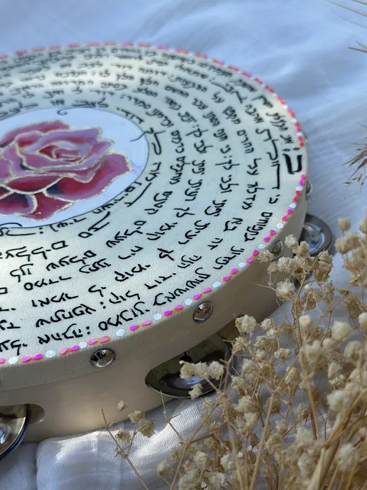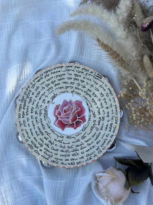 פרק ב' מתוך ספר שיר השירים כתוב בכתב יד על התוף. במרכז התוף ציור מרהיב של שושנה ורודה ועיטורי דץ זהב במסגרת עלי הכותרת.