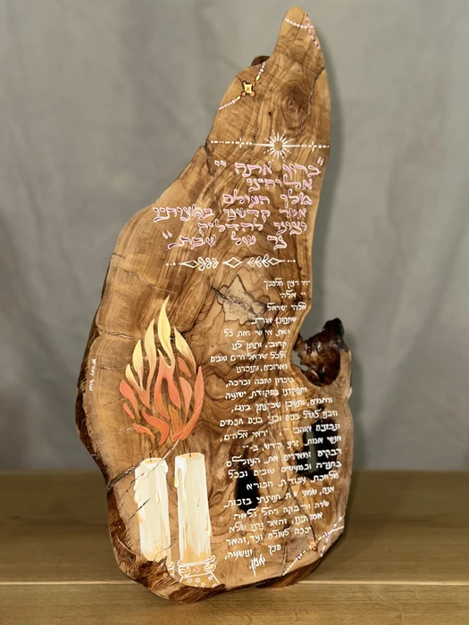ברכת הדלקת נרות כתובה בכתב יד על עץ זית טבעי ומהמם בגודל 42 ס"מ