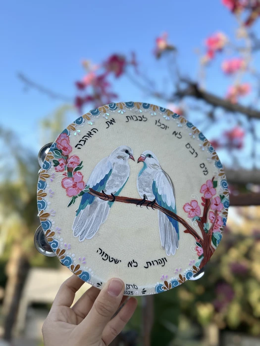 ברכת כלה על תוף עשוי עור אמיתי וציור זוג יונים קרובים על ענף של עץ שקדייה מעוטר בפרחים וורודים