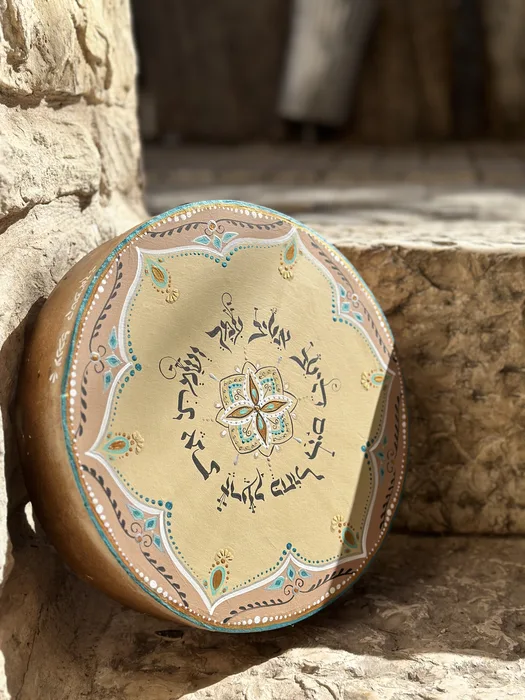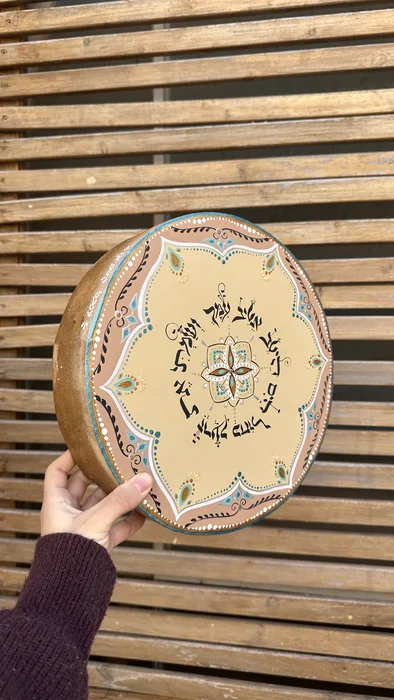 רקע התוף צבוע בצבע אקריליק איכותי ועמיד, מעוטר במסגרת מנדלה מרהיבה ומהממת בגווני לבן, חום ותכלת